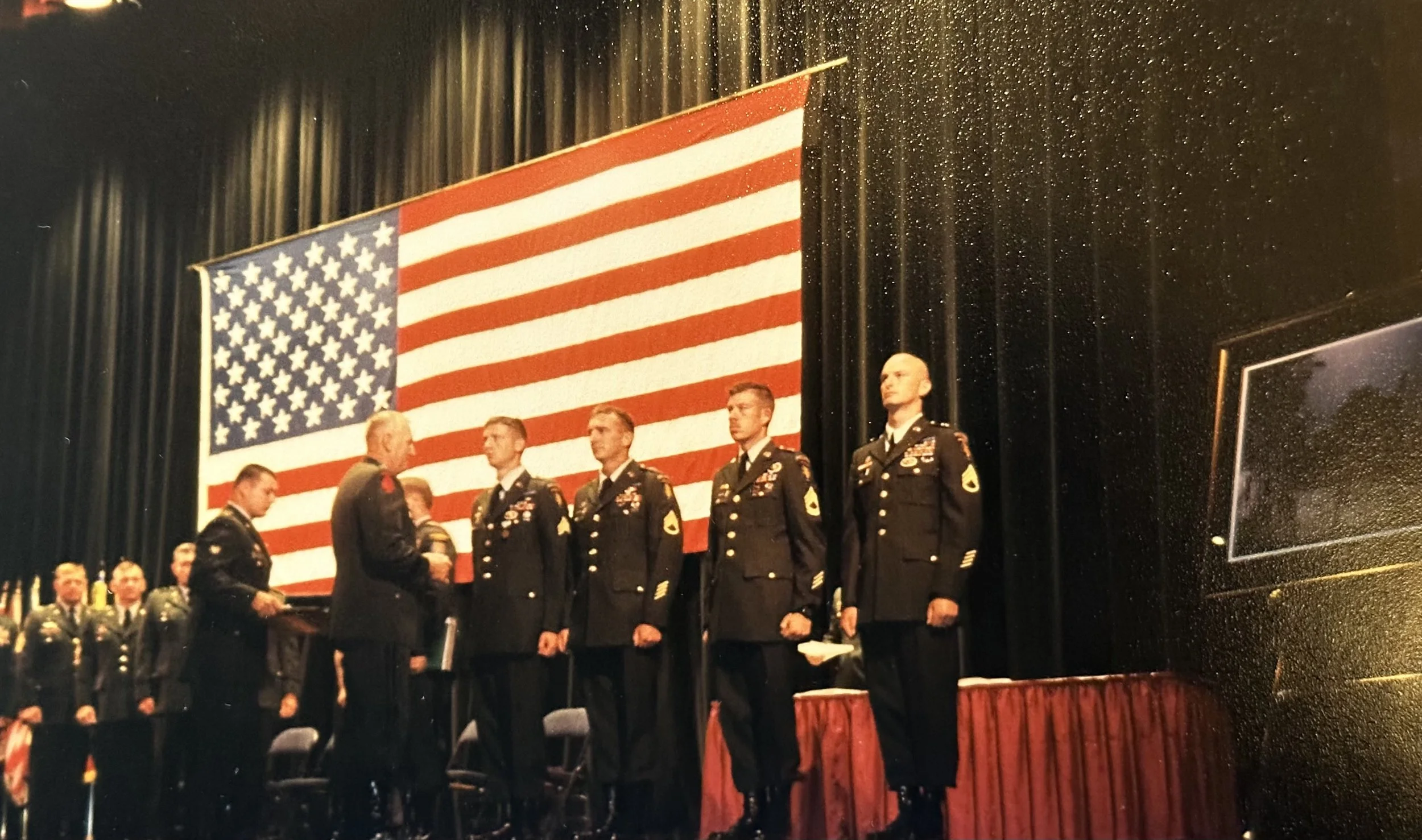 SSG Davis (far right) as the honor graduate "Buck Knife Award" for the Special Forces Communications Sergeants Course at the United States Army John F. Kennedy Special Warfare Center and School (USAJFKSWCS) in 2000
